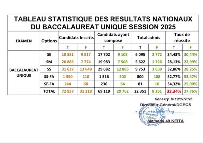 Ça y est ! Les résultats du Baccalauréat unique session 2025 sont disponibles. Ils ont été rendus publics ce samedi 19 juillet 2025 par le ministère de l’enseignement pré-universitaire et de l’Alphabétisation. Le taux de réussite cette année est de 32,34% toutes options confondues, soit 22 351 admis dont 8 261 filles.