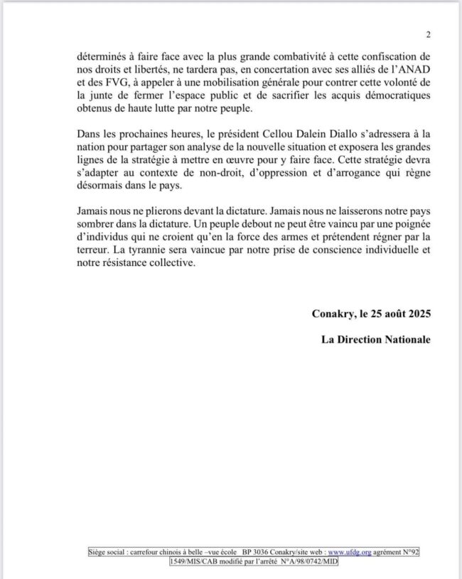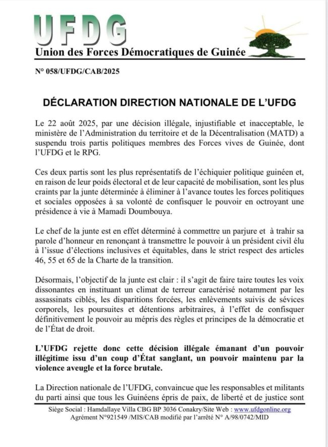 La Direction Nationale de l’Union des Forces Démocratiques de Guinée (UFDG) dénonce avec véhémence la décision du MATD de suspendre le parti la qualifiant d’illégale et injuste. Les cadres de cette formation politique dirigée par Cellou Dalein Diallo y voient une manœuvre de la junte visant à confisquer le pouvoir et à bâillonner toute voix dissonante, et appellent à la mobilisation générale pour la défense de la démocratie et de l’État de droit.