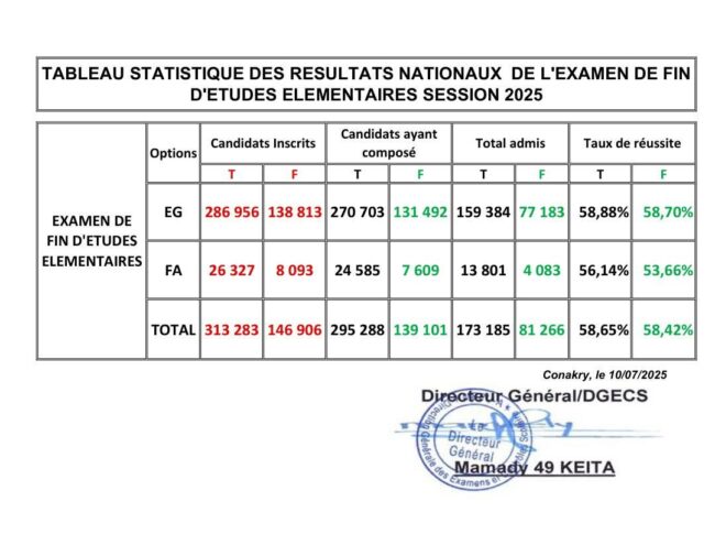 Le ministère de l’Éducation nationale et de l’Alphabétisation a publié ce jeudi 10 juillet, les statistiques des résultats nationaux du certificat de fin d’études élémentaires (CEE) session 2025. Le taux global de réussite est de 58,65%. Le nombre total de candidats admis est de 173185, dont 81266 filles.