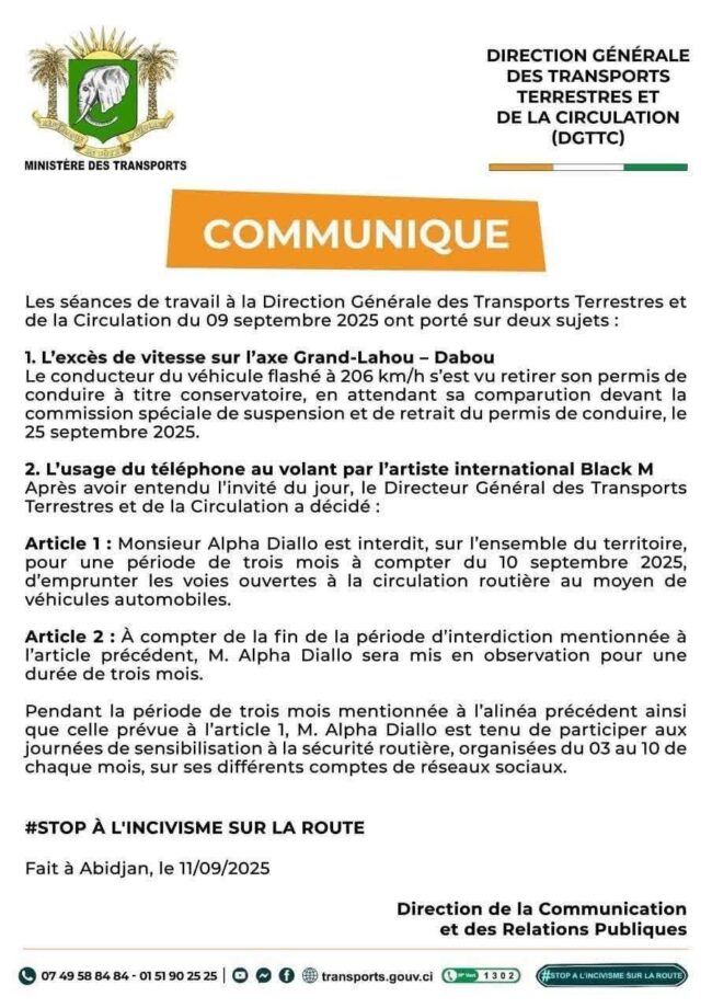 Le ministère des Transports de Côte d’Ivoire à travers la Direction Générale des Transports Terrestres et de la Circulation (DGTTC), a pris des mesures contre l’artiste Black M, alias Alpha Diallo, après l’avoir interpellé pour l’usage de son téléphone au volant. L’artiste est interdit de conduite sur le territoire ivoirien pour une période de trois mois. Cette sanction s’inscrit dans le cadre de la politique de sécurité routière mise en place par les autorités du pays.
