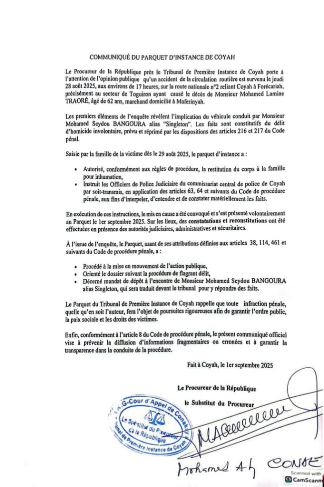 Le Parquet du Tribunal de Première Instance de Coyah a annoncé dans un communiqué publié ce lundi 1er septembre, avoir placé sous mandat de dépôt l’artiste Singleton. Cela fait suite à un accident de la circulation survenu le 28 août qui a coûté la vie à Mohamed Lamine TRAORÉ. Mohamed Seydou Bangoura, alias « Singleton », est suspecté d’homicide involontaire.