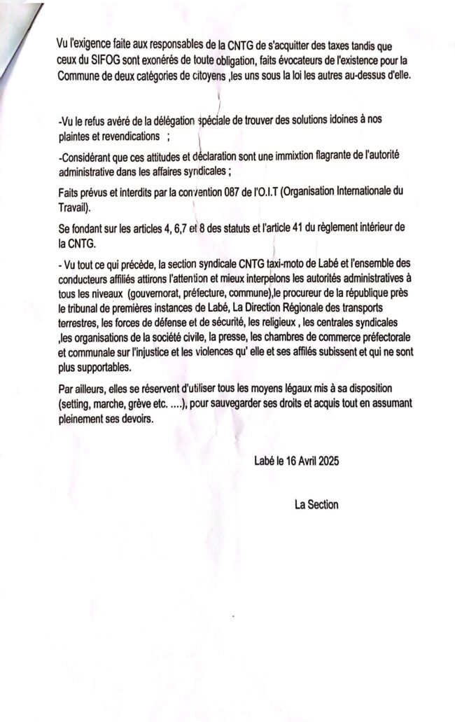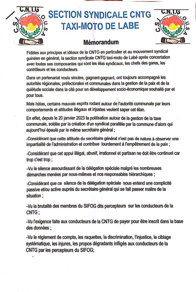 Dans un mémorandum publié daté du16 avril 2025, la section syndicale CNTG des conducteurs de taxi-moto de Labé tire la sonnette d’alarme sur ce qu’elle qualifie de dérives qu’elle dit constater dans la gestion de la taxe communale et l’ingérence selon elle, « flagrante » des autorités locales dans les affaires syndicales. Pointant du doigt le soutien illégal apporté par un secrétaire général à un syndicat parallèle créé dans un contexte de politisation de la gestion fiscale, le syndicat dénonce des comportements jugés abusifs, discriminatoires et violents, notamment de la part des agents du SIFOG.
