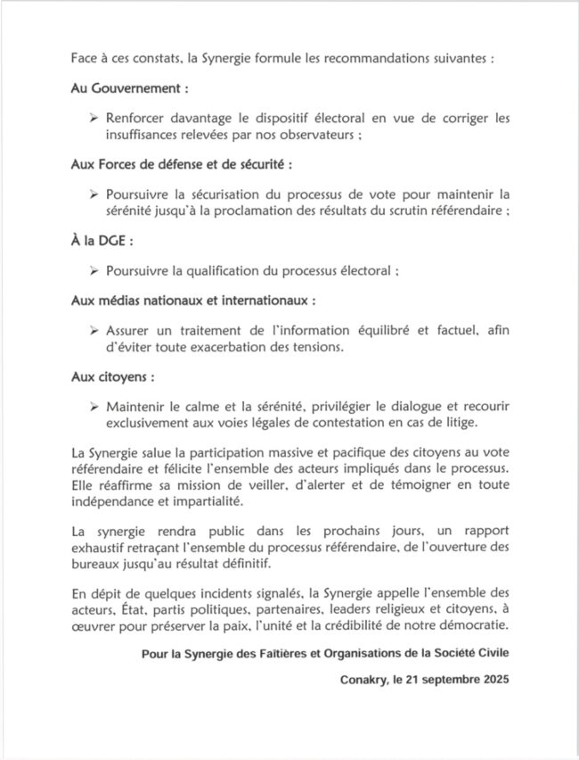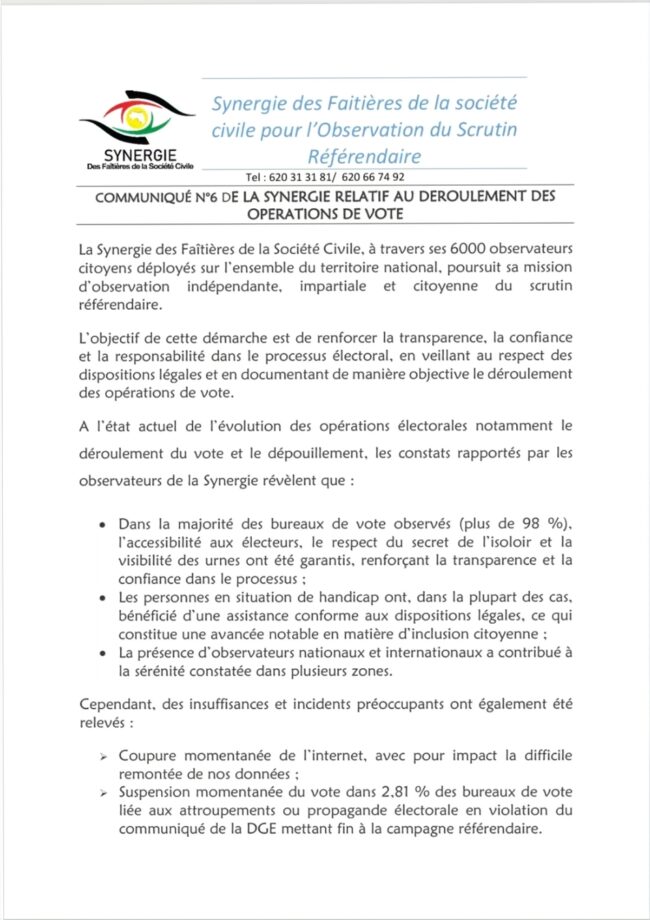 La Synergie des Faîtières de la Société Civile pour l’Observatoire du Scrutin Référendaire a publié un rapport sur le déroulement du vote le dimanche 21 septembre 2025. Alors qu’il salue l’accès aux bureaux de vote et le respect du droit des citoyens, particulièrement les personnes à mobilité réduite et le constat global fourni par ses observations déployés à travers le pays reste mitigé en raison de plusieurs incidents mineurs.