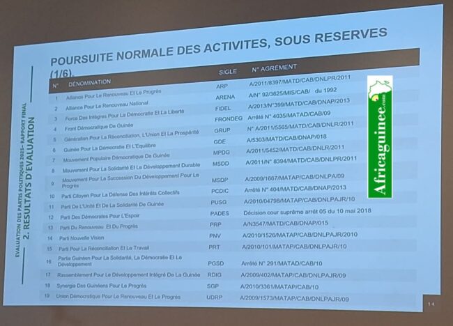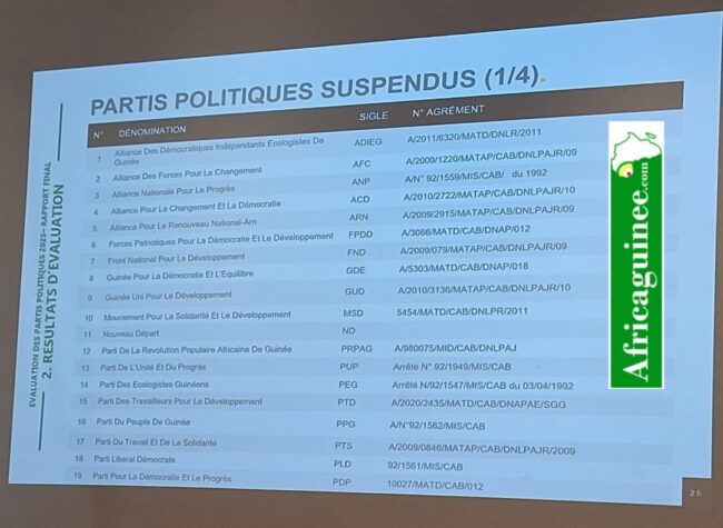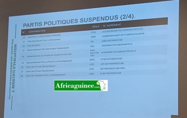 En Guinée, le ministère de l’Administration du Territoire et de la Décentralisation (MATD) a publié ce vendredi 14 mars 2025, les résultats de l’évaluation des partis politiques. Le verdict rendu par le Ministère de tutelle fait couler encre et salive au sein de l’opinion. Ce résultat indique que plusieurs formations politiques, dont certaines très influentes dans la sphère politique du pays, ont été suspendues pour une période de trois mois. Parmi elles, le RPG Arc-en-ciel et l’Union des Forces Républicaines (UFR) de Sidya Touré.