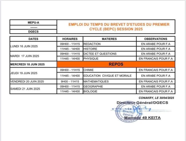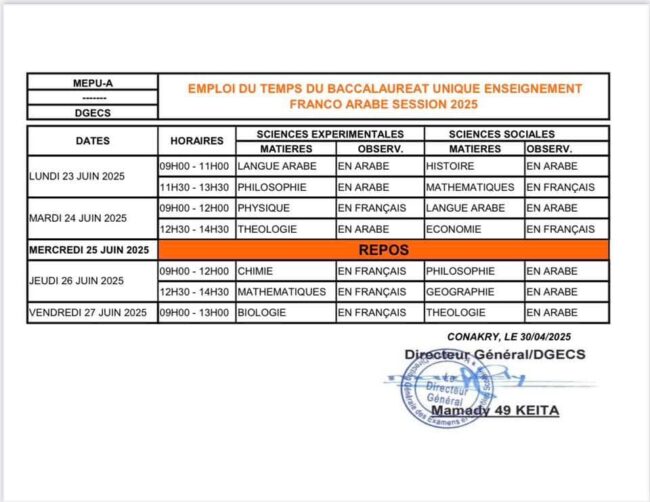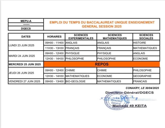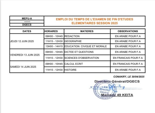 Les élèves guinéens – candidats aux différents examens nationaux session 2025 – sont désormais situés sur le calendrier et les emplois du temps de la composition des différents épreuves. C’est ce vendredi 2 mai que le ministère de l’éducation nationale et de l’alphabétisation a rendu public le calendrier ainsi que les emplois du temps de l’élémentaire au secondaire en passant par le pré-universiataire.