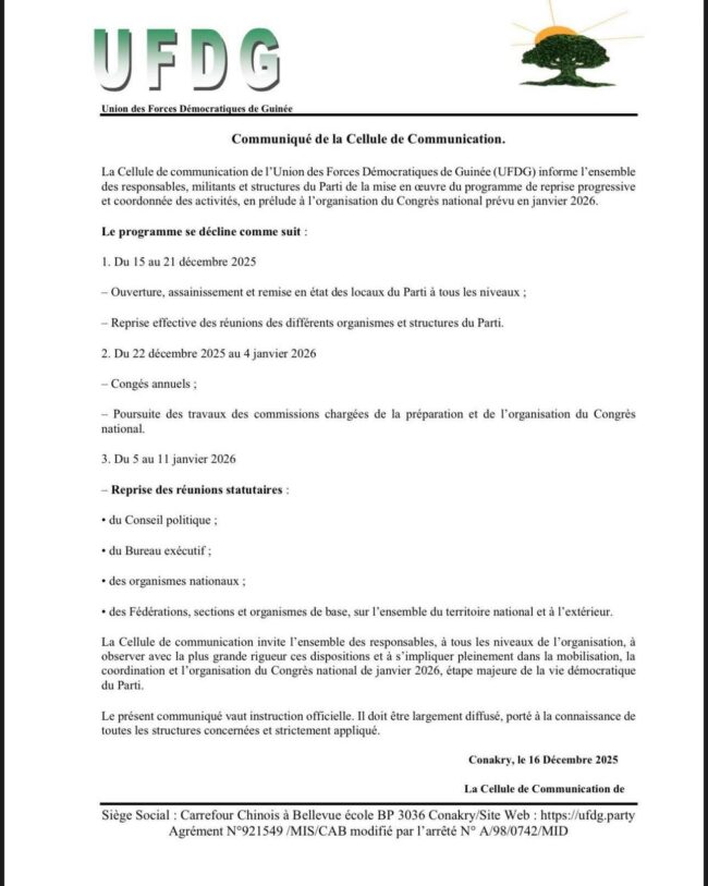 L’union des Forces Démocratiques de Guinée (UFDG), à travers sa cellule de communication a annoncé mardi 16 décembre 2025, la reprise progressive de ses activités politiques à travers tout le pays et à l’étranger. Cette annonce intervient après l’expiration de trois mois de suspension. Le parti dirigé par Cellou Dalein Diallo a annoncé également que son congrès électif se tiendra en janvier 2026.
