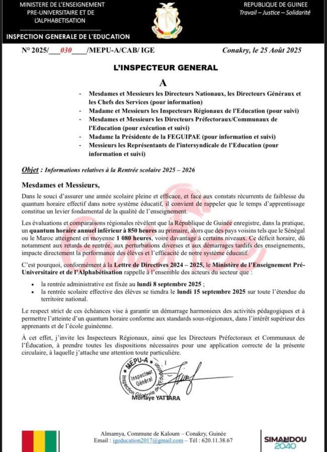 Alors que le ministère de l’Enseignement pré-universitaire et de l’Alphabétisation avait annoncé lundi, que la date de la rentrée scolaire est fixée au 25 septembre, le département ravise et ramène la date de la rentrée au 15 septembre 2025 dans tous les établissements publics et privés du pays.