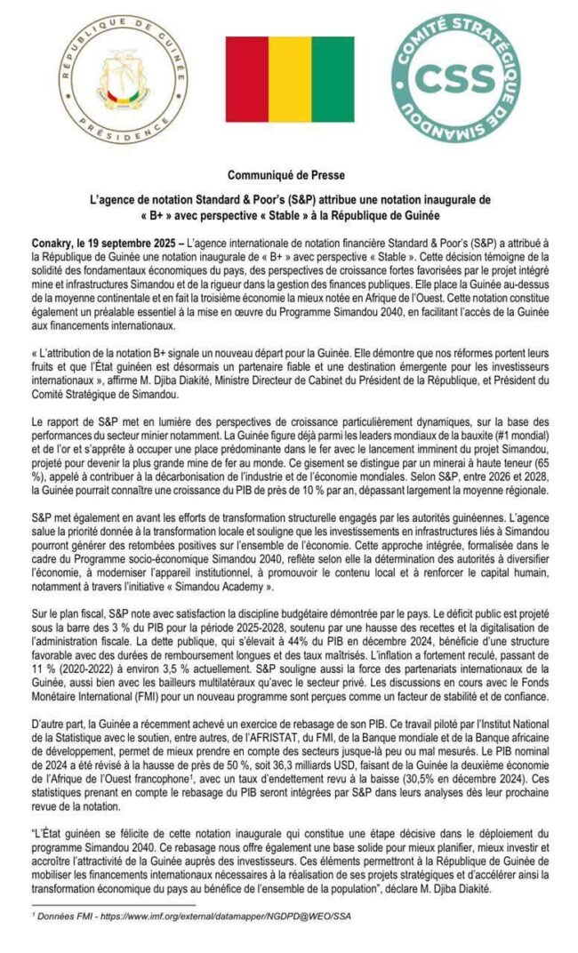 La Guinée se positionne sur la scène économique mondiale. L’agence de notation américaine “Standard & Poor’s” (S&P) a attribué au pays une note encourageante : « B+ » avec une perspective « Stable ». Cette notation qui, d’ailleurs, est une première souligne la solidité de ses fondamentaux économiques, la rigueur de sa gestion financière, et permet de gagner la confiance des investisseurs.