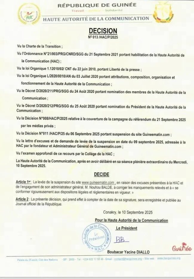 Le média en ligne Guinéematin.com est de nouveau accessible. Une décision de la Haute Autorité de la Communication (HAC) en date du 10 septembre 2025 met fin à sa suspension, suite à des « excuses » formulées par la direction du site et à un « engagement » de se conformer aux dispositions en vigueur. C’est ce qu’a annoncé la HAC.