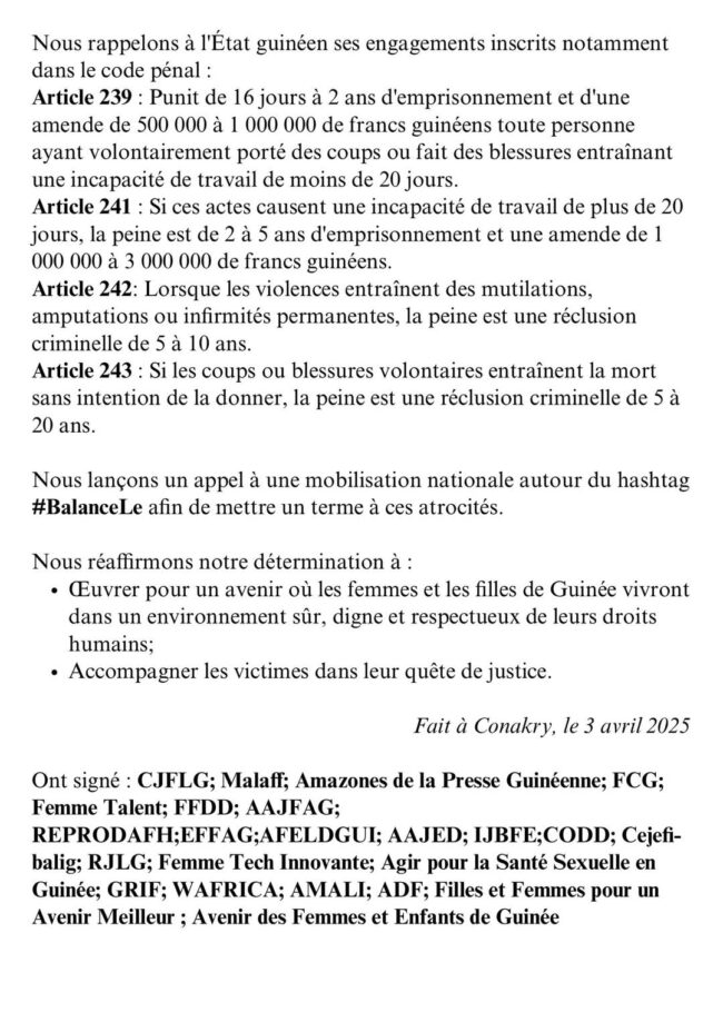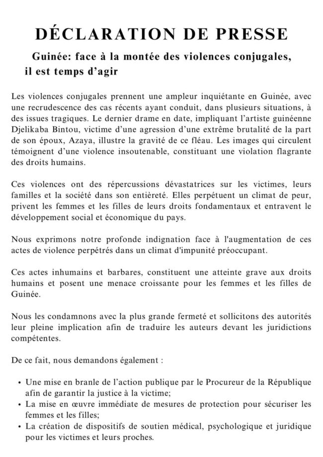 Depuis qu’elle a publié ses images dans lesquelles elle a été sévèrement violentée, l’artiste Djelykaba Bintou continue de bénéficier des soutiens de l’opinion qui expérime son indignation. Les ONG de défense des droits des femmes ont de leur côté, dénoncé à travers une déclaration conjointe publiée ce jeudi 3 avril, ce qu’elles qualifient d’une « agression d’une extrême brutalité » de la part du mis en cause, en l’occurence, Azaya, l’époux de Djelykaba Bintou.
