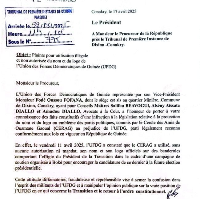 L’Union des Forces Démocratiques de Guinée (UFDG) a saisi la justice pour dénoncer « l’usage illégal » de son nom et de son logo par le Cercle des Amis de Ousmane Gaoual (CERAG). Selon le parti, ces éléments ont été utilisés sans autorisation lors d’une campagne de soutien au Président de la Transition. L’UFDG estime que cette manœuvre vise à manipuler l’opinion publique et à semer la confusion sur sa position concernant la Transition et le retour à l’ordre constitutionnel.