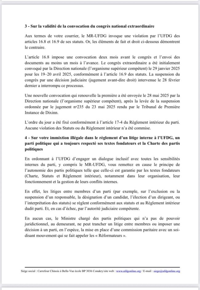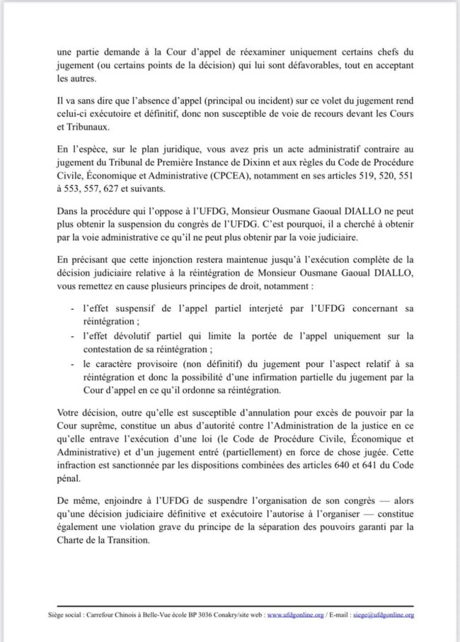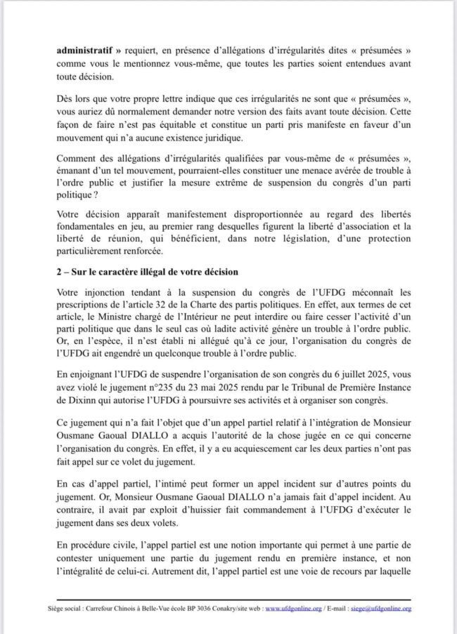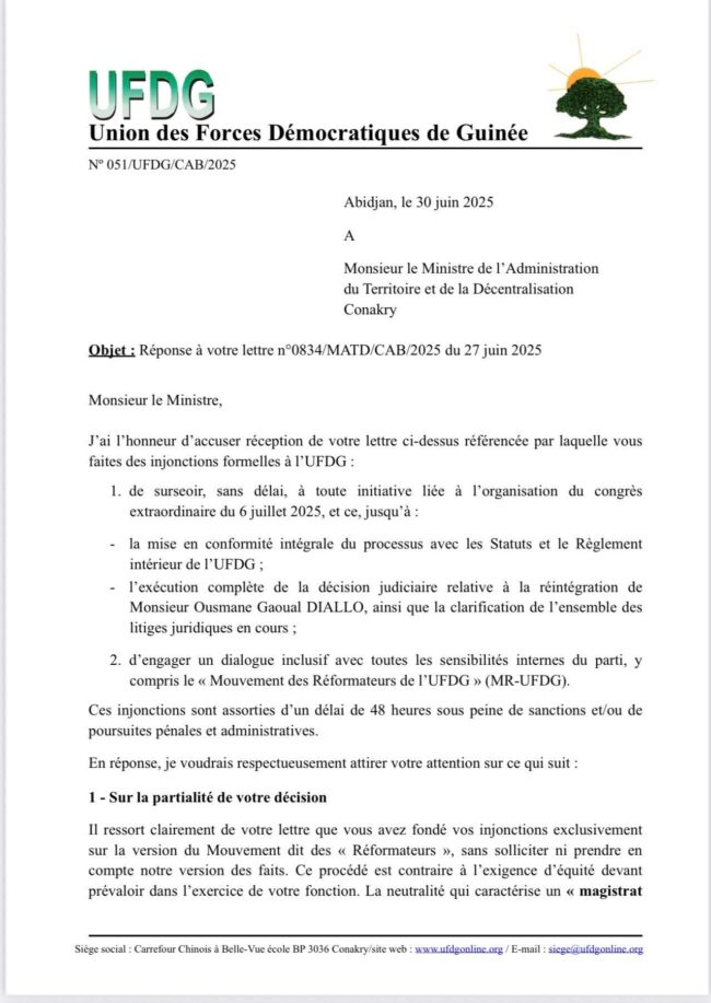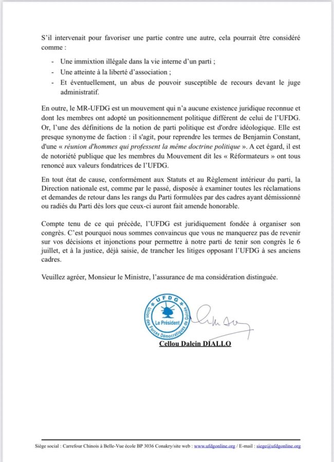 A travers un courrier adressé au ministre par Cellou Dalein Diallo, président de l’UFDG, il affirme que les actions de son parti qu’il dirige sont conformes à ses statuts et règlements, rejetant toute allégation d’irrégularité et demandant au Ministre de réexaminer sa position.