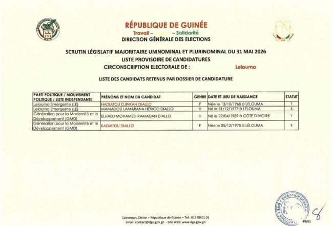 La Direction Générale des Élections (DGE) a rendu publique la liste provisoire des candidatures en vue des élections législatives prévues le 31 mai 2026. Dans la circonscription électorale de Lelouma, quatre candidats ont été provisoirement retenus à ce stade du processus.