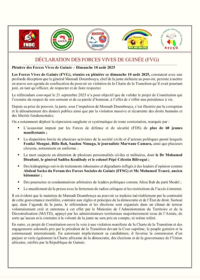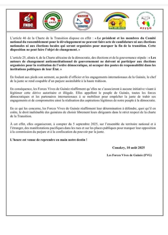 Les forces vives de Guinée passent à la vitesse supérieure. Dimanche 10 août 2025, elles ont tenu une réunion où une décision majeure a été prise : s’opposer à ce qu’elles qualifient de « confiscation du pouvoir » par le général Mamadi Doumbouya, chef de la junte. Les acteurs politiques et sociaux des FVG appellent ainsi les citoyens à manifester pour exiger du président de la transition qu’il respecte ses engagements.