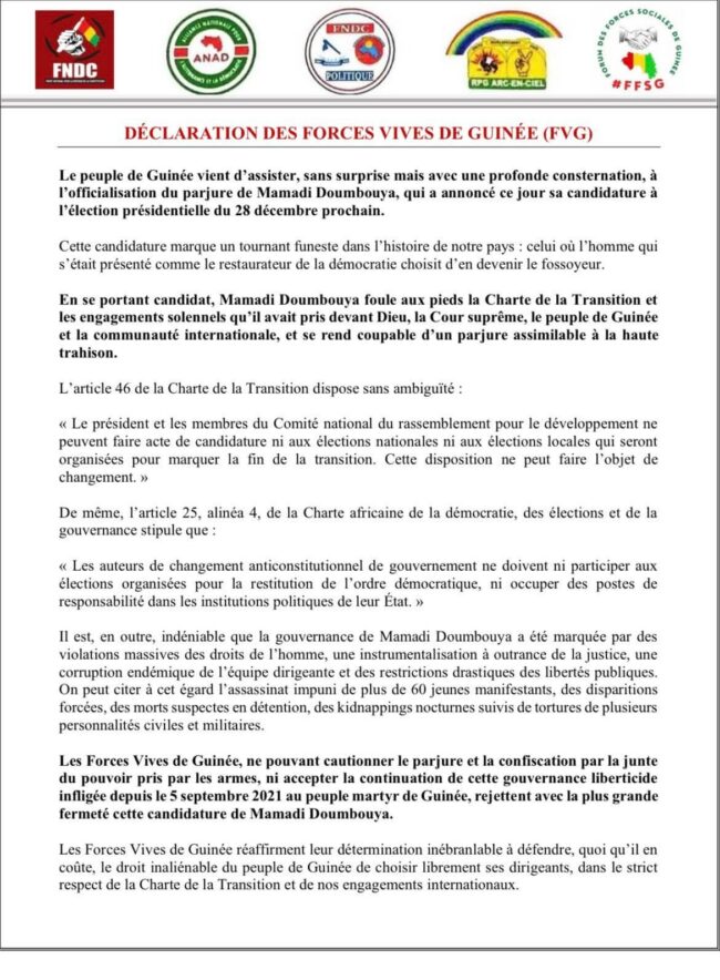 Les Forces Vives de Guinée viennent de réagir à la candidature du général Mamadi Doumbouya. Elles dénoncent avec fermeté la candidature du général Mamadi Doumbouya, qu’elles qualifient de parjure et de haute trahison envers la Charte de la Transition. Dans une déclaration au ton ferme, elles accusent le chef de la junte d’avoir confisqué le pouvoir par les armes et violé ses engagements devant le peuple de Guinée et la communauté internationale. Elles appellent les Guinéens à une mobilisation massive pour défendre les libertés démocratiques acquises au prix du sang et des sacrifices.