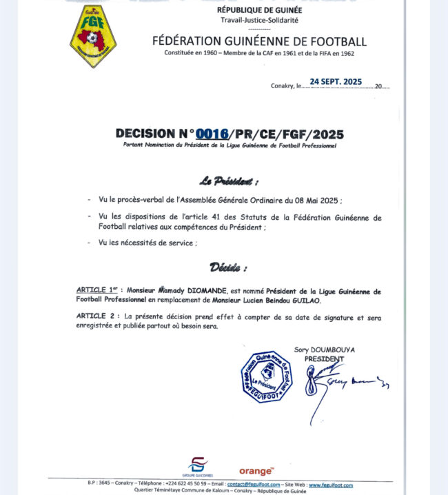 La décision de nomination a été signé par le président de FGF, Sory Doumbouya.