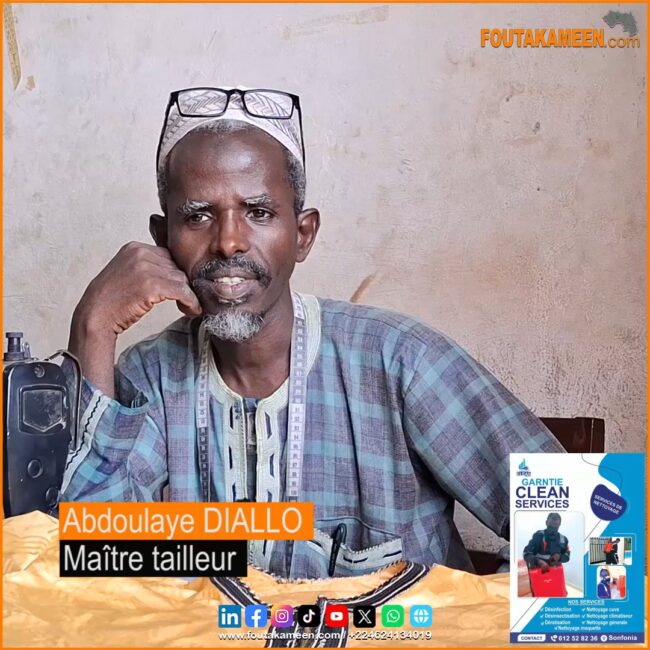 Nous sommes à l’atelier de couture de Maître Mamadou Sanou Diallo, situé au marché de Daka dans la commune urbaine de Labé. Nous l’avons trouvé en pleine concentration derrière sa machine à coudre, s’efforçant d’honorer les engagements pris envers ses clients à quelques heures de la fête du Ramadan.