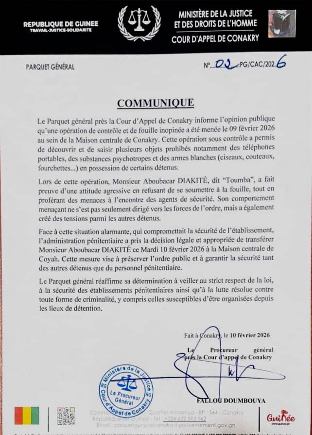 Le calme de la Maison centrale de Conakry a été rompu dans la matinée de ce mardi 10 février 2026. Suite à une “fouille inopinée” ayant révélé “la présence d’objets illicites”, Aboubacar Diakité, dit « Toumba », a été transféré de force vers le centre de détention de Coyah.
