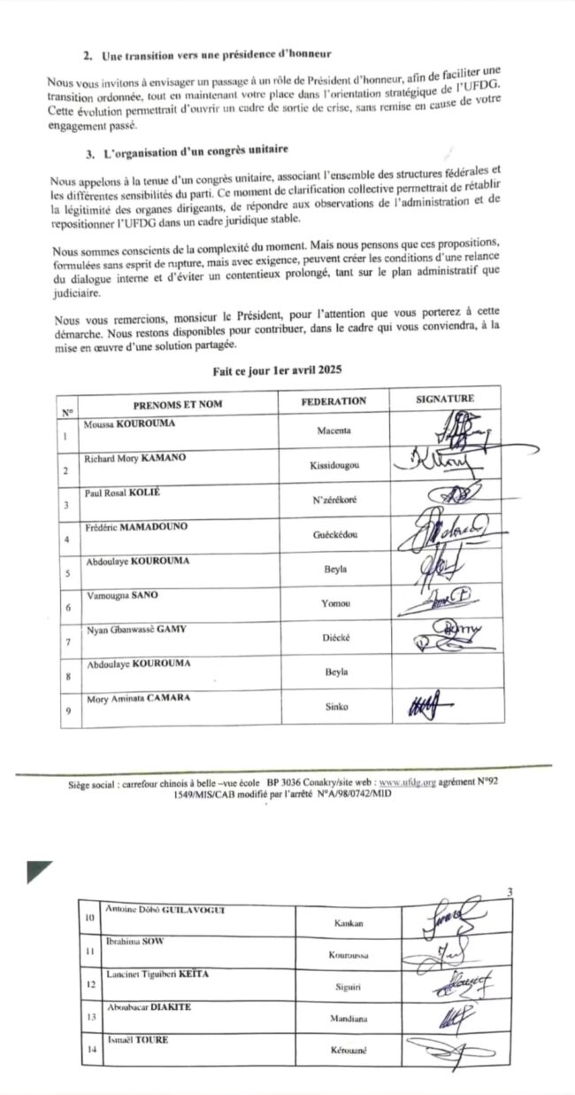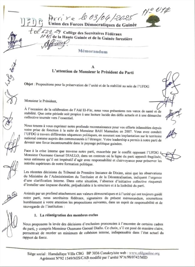 Ils sont au nombre de quatorze secrétaires fédéraux de l’union des forces démocratiques de Guinée, à avoir signé un mémorandum adressé à Cellou Dalein Diallo, dans lequel, ils sollicitent son départ à la tête du parti. Ces secrétaires fédéraux dans certaines préfectures de la Haute Guinée et de la Guinée Forestières motivent leur mémorandum par selon eux, « le conflit opposant I’UFDG a Monsieur Ousmane Gaoual DIALLO, dans un contexte où la ligne du parti apparaît fragilisée », estimant « qu’il est impératif d’agir avec responsabilité et clairvoyance pour préserver les intérêts supérieurs de notre formation politique ».