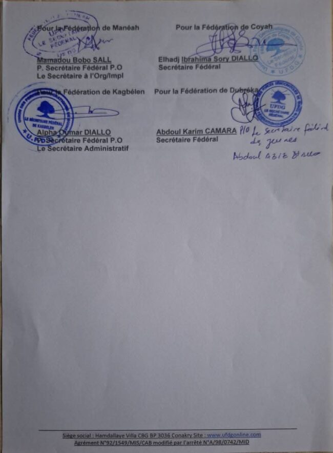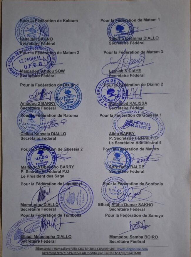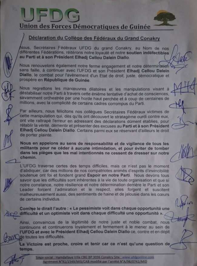 Les secrétaires fédéraux de l’union des forces démocratiques de Guinée du grand Conakry viennent à la contre-attaque de leurs collègues de la forêt et de la Haute Guinée. Dans une déclaration conjointe, ces Fédéraux de l’UFDG du Grand Conakry ont réaffirmé leur fidélité au parti et à son président Elhadj Cellou Dalein Diallo. Ils dénoncent des manœuvres de déstabilisation orchestrées par des forces hostiles et appellent les militants à la vigilance. Malgré les difficultés, ils restent confiants quant à la victoire et l’avenir du parti.