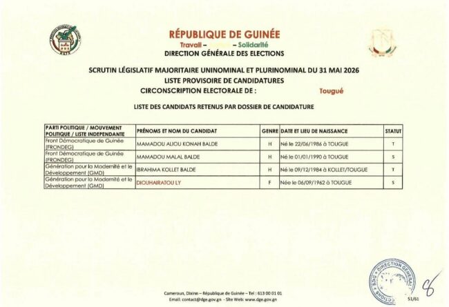 La Direction Générale des Élections (DGE) a publié le mercredi 16 avril la liste provisoire des candidats retenus pour le scrutin législatif du 31 mai prochain. À Tougué, la bataille pour l’unique siège de député se jouera entre le Front Démocratique de Guinée (FRONDEG) et la Génération pour la Modernité et le Développement (GMD).