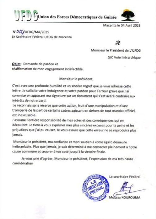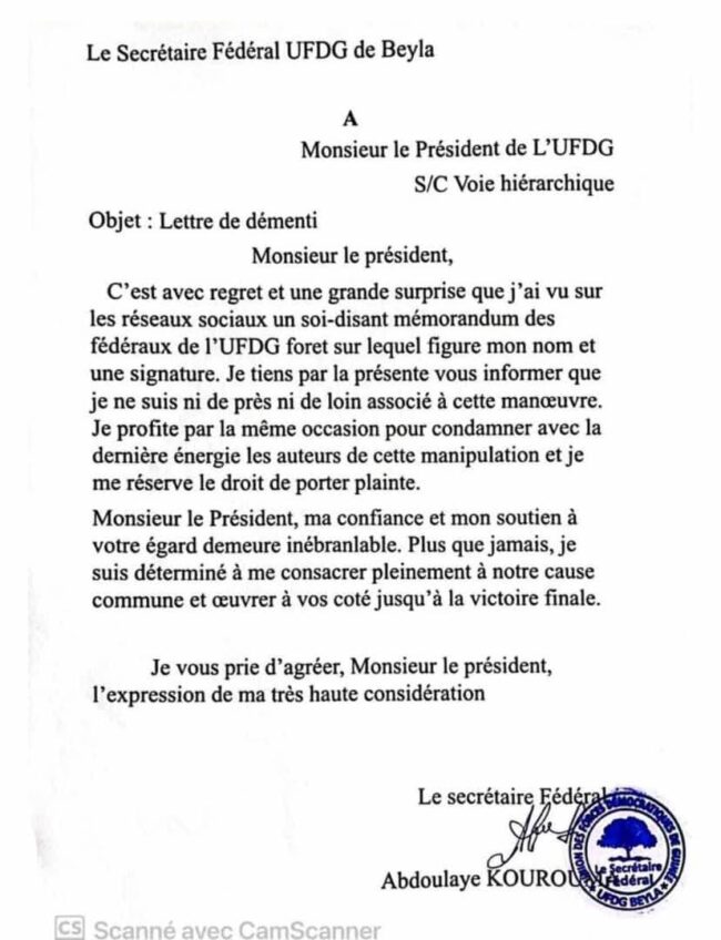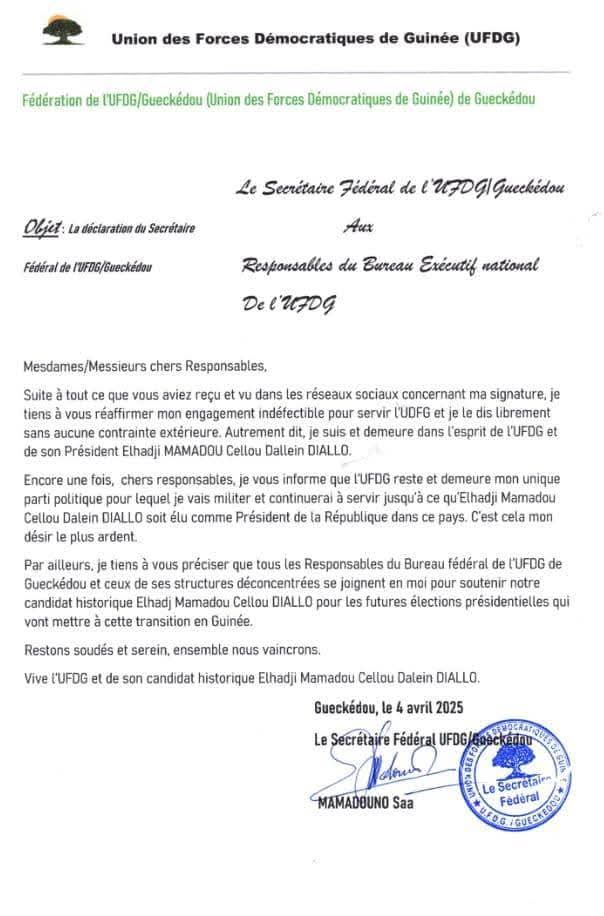 Dans une série de lettres adressées à la direction du parti, les Secrétaires Fédéraux de Macenta, Guéckédou et Beyla réaffirment leur soutien indéfectible à Cellou Dalein Diallo. Tandis que certains évoquent une erreur ayant conduit à leur signature, d’autres dénoncent une falsification et menacent de poursuites judiciaires contre les instigateurs de cette action.
