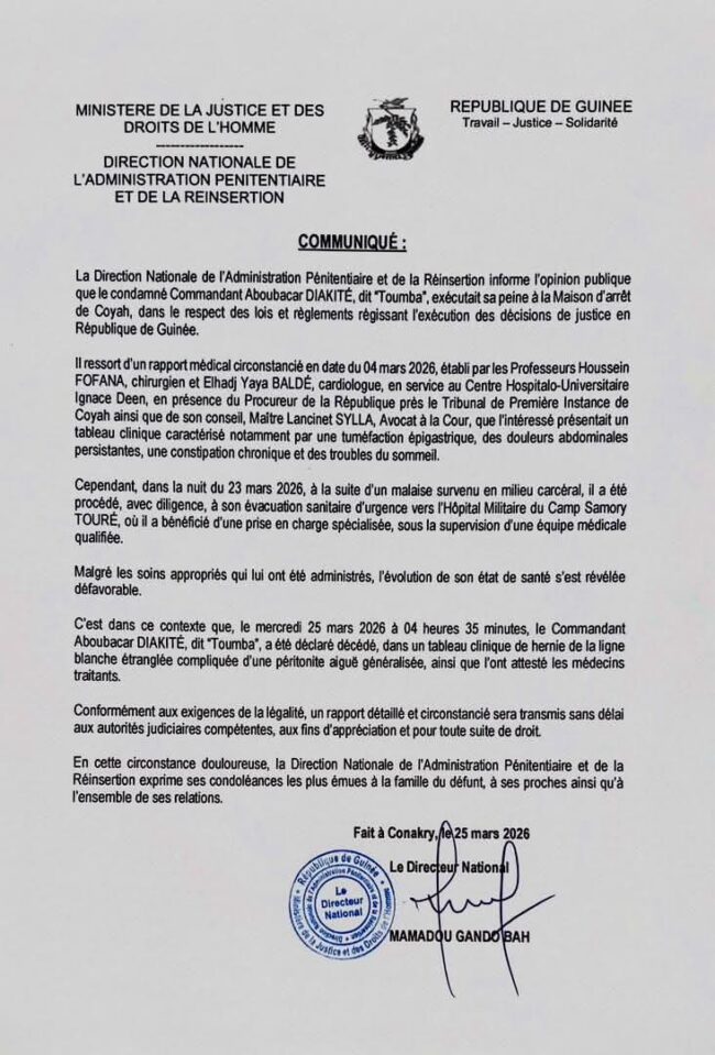 Le commandant Aboubacar Diakité est décédé dans la nuit du 25 mars 2026 à Conakry, après une évacuation d’urgence depuis la maison d’arrêt de Coyah. Selon un communiqué de l’administration pénitentiaire, il a succombé à des complications liées à une hernie étranglée ayant évolué en péritonite aiguë généralisée, malgré une prise en charge médicale spécialisée.